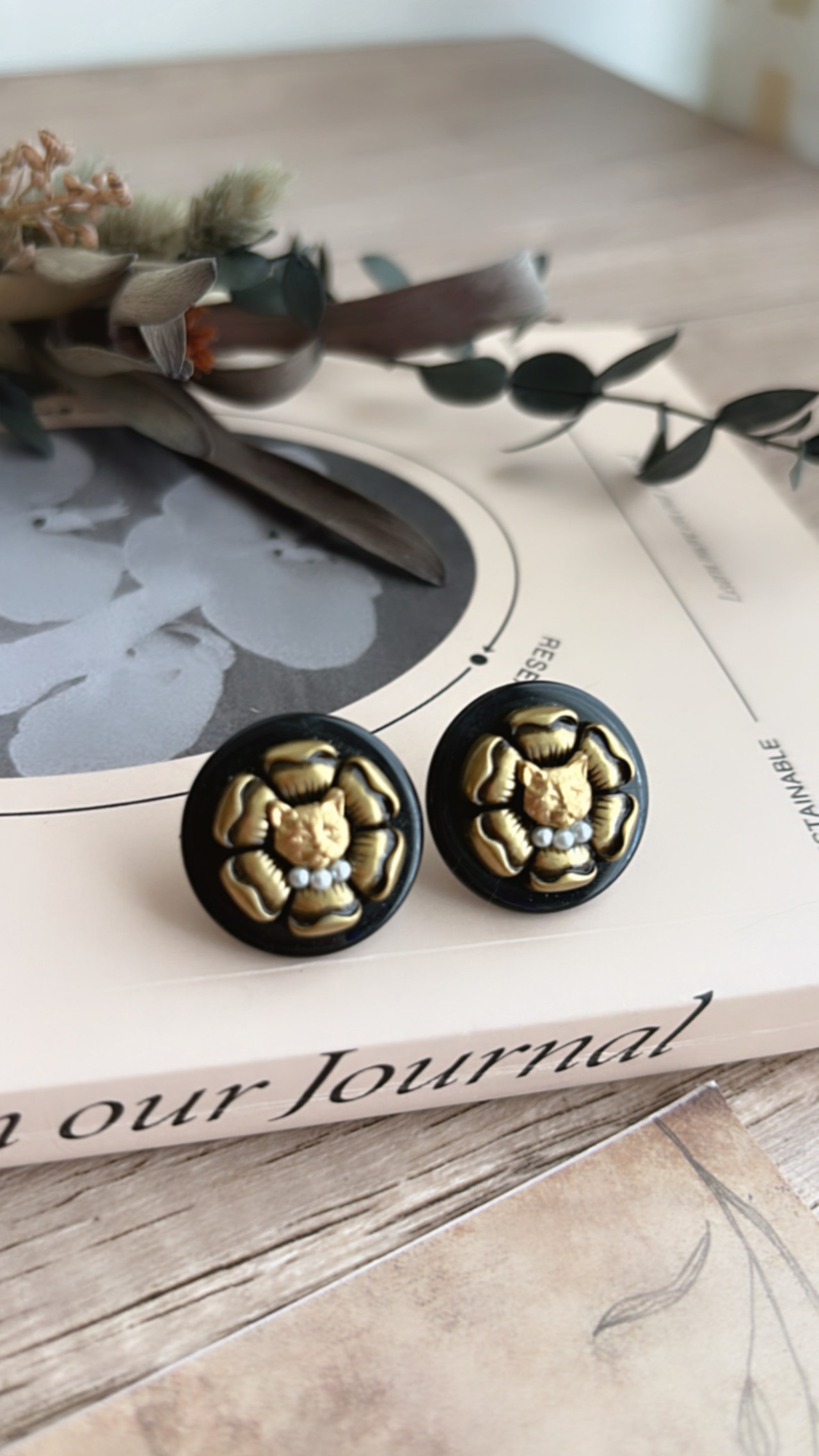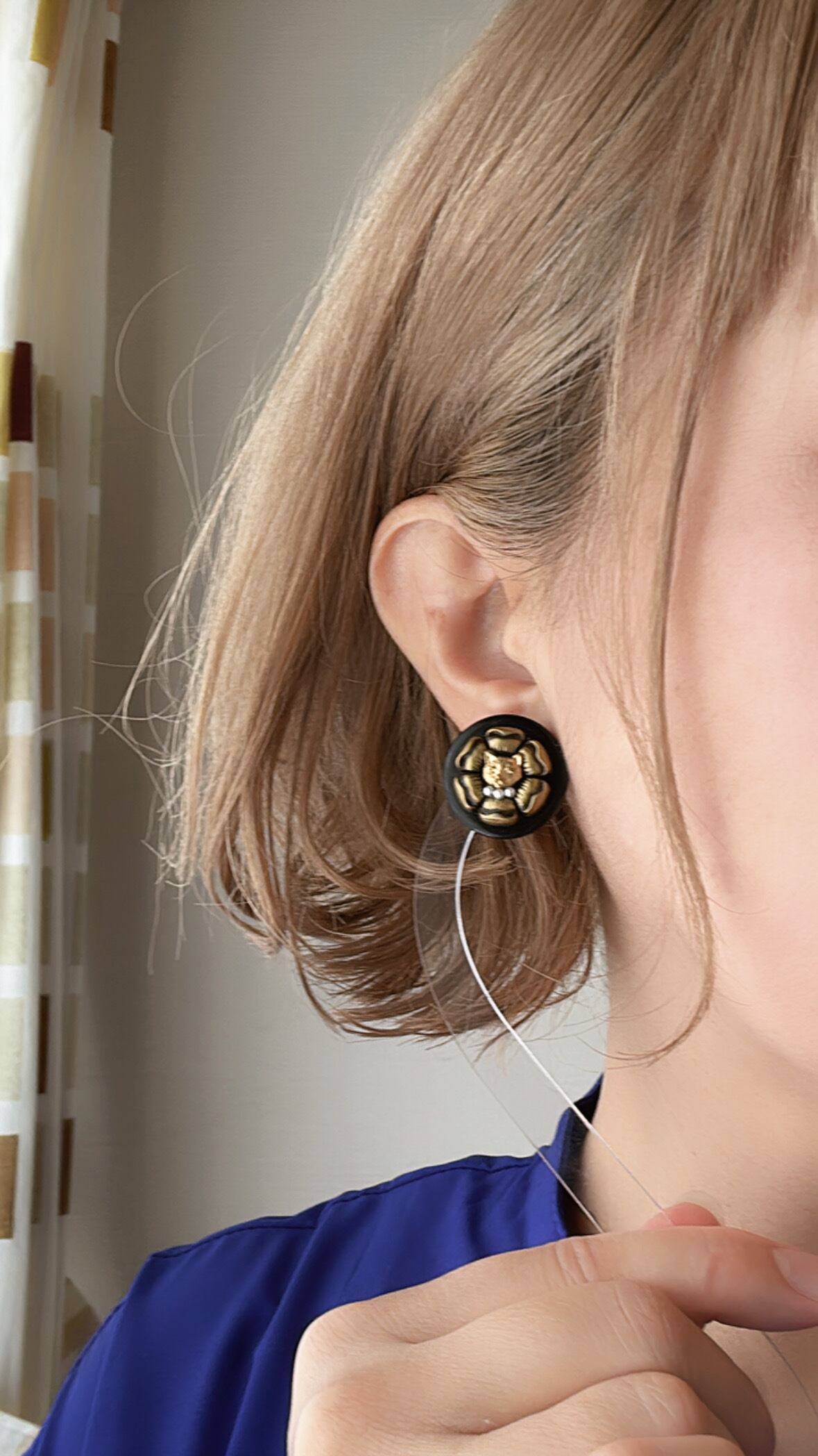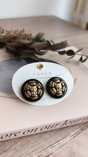 ヴィンテージボタンに 様々なパーツを装飾した ヴィンテージピアス⋈*。゚ 真ん中には 小さなネコちゃんがいます︎☺︎︎☺︎︎☺︎