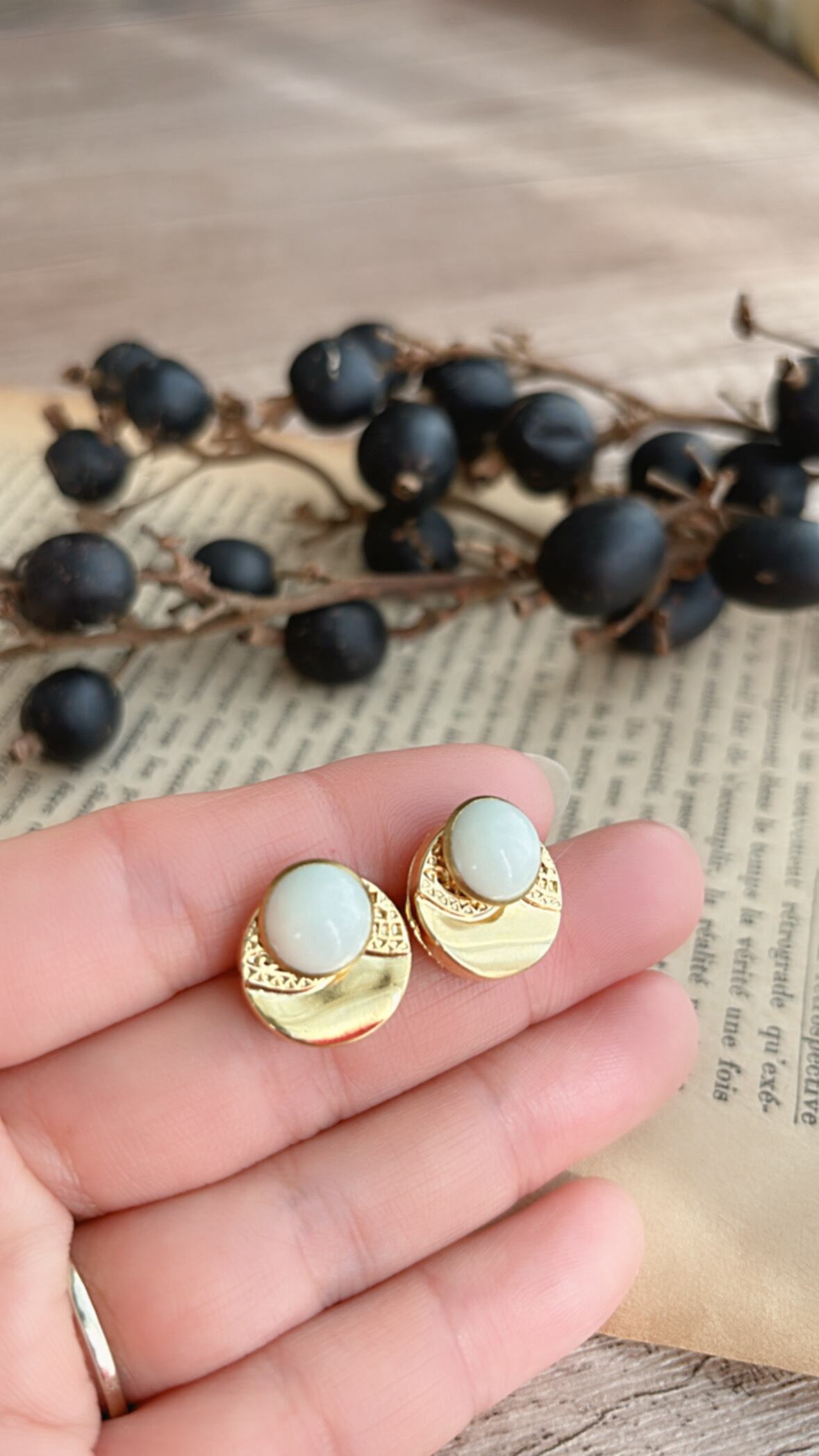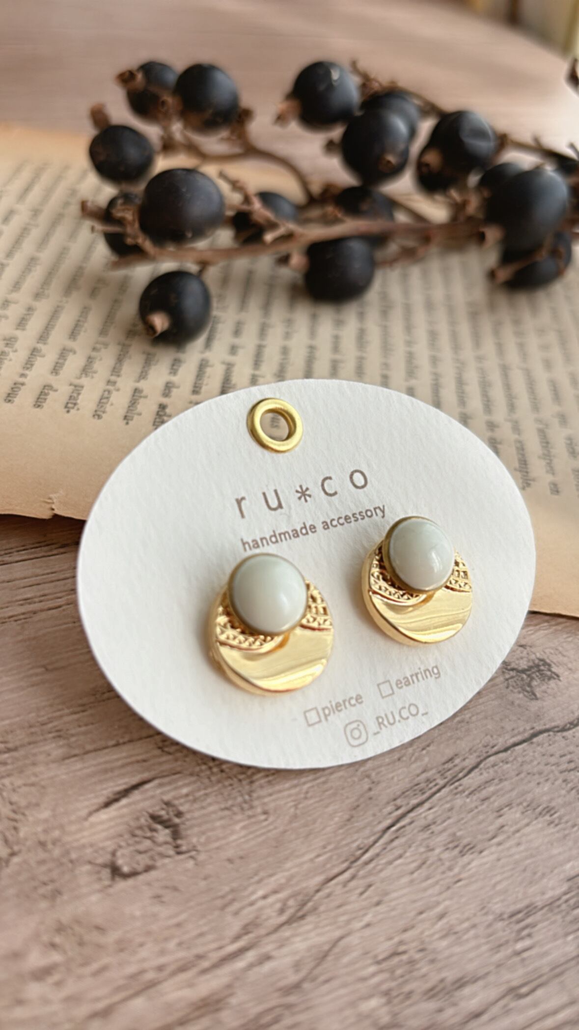レトロボタンを組み合わせ小ぶりピアス